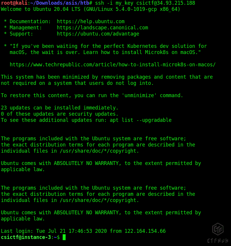 Now that the hard part of adding our public key is done, we just have to ssh into csictf user ssh -i my_key csictf@34.93.37.238 and voila "We are in boissss!",