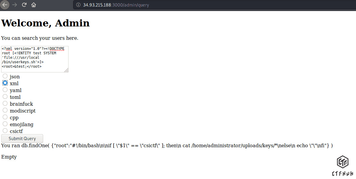 Hmm, seems like they are using a custom check for authorizing the users. Wish we could read what is in the /usr/local/bin/userkeys.sh. Oh yes, we have that xml vulnerability. Lets use that to get the contents of the file.