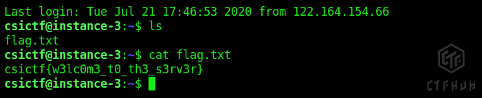 It's almost cakewalk after this. We find a flag.txt in the home folder of csictf user, csictf{w3lc0m3_t0_th3_s3rv3r}