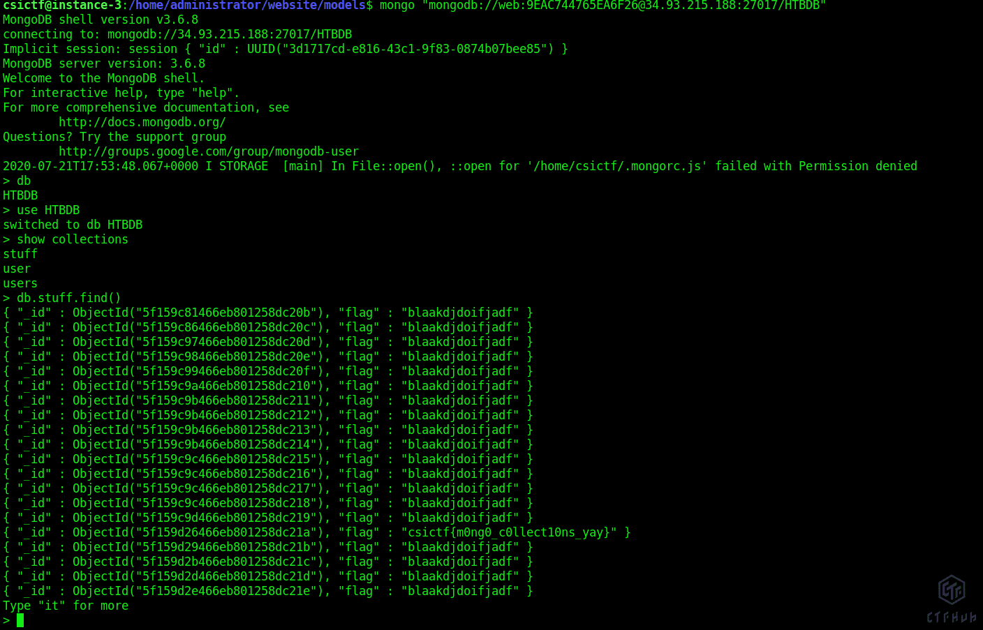 List the collections in the db using show collections. We find three collections: stuff, user,users. We read all the documents in the collection stuff using db.stuff.find(). In one the documents, we find the flag csictf{m0ng0_c0llect10ns_yay}