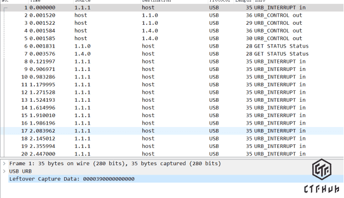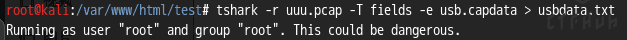 用wireshark打开流量包可以看到是usb协议,且leftover capture data域的数据长度为八个字节,所以可以判断出是键盘流量包。在kali中用tshark命令将leftover capture data域的数据提取出来。