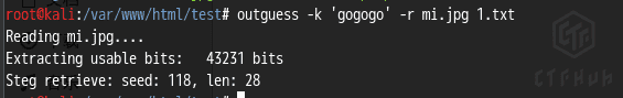 然后就剩mi.jpg了,flag是隐写在mi.jpg中的,隐写方式是outguess隐写,gogogo就是密钥。其实题目名和题目说明都有猜,这就是在提示隐写方式。直接用工具把flag分离出来就行了