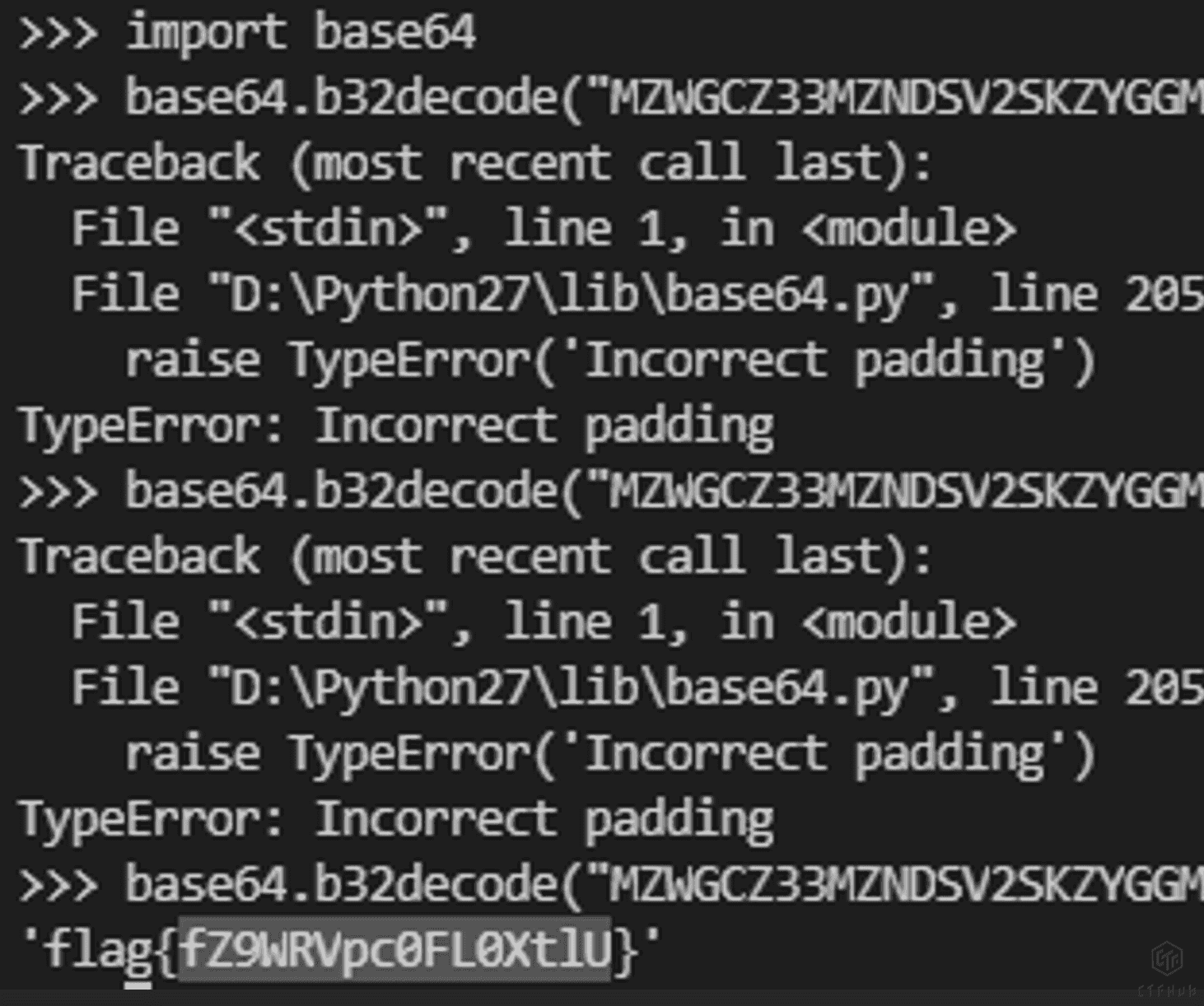 提取得到字符串:MZWGCZ33MZNDSV2SKZYGGMCGJQYFQ5DMKV6Q,解三次base32就可以得到flag了