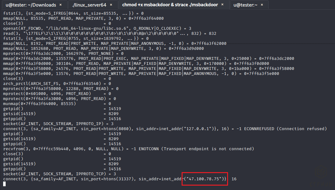 然后直接 strace 即可看到实际 C2 的 IP 和端口。