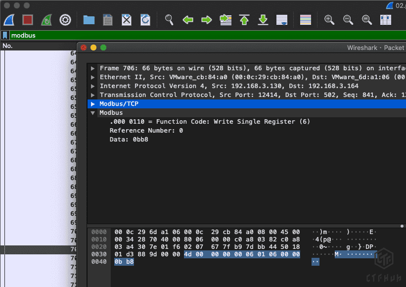 打开附件为modbus流量,分析流量找到写入相关数据包
