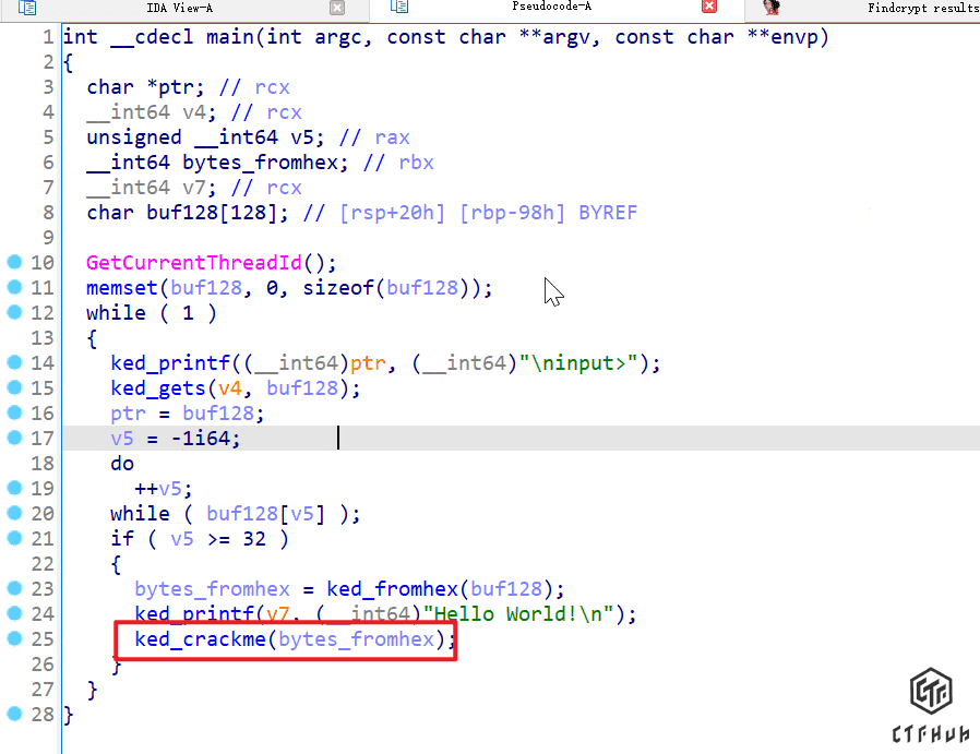 程序流程,输入32长度的哈希字符串,bytes.fromhex然后运行关键 crackme 函数。