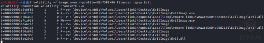 找到可疑进程EvilImage,然后利用filescan|grep "Evil"寻找程序本体