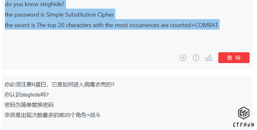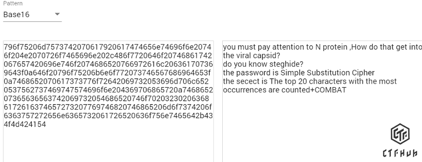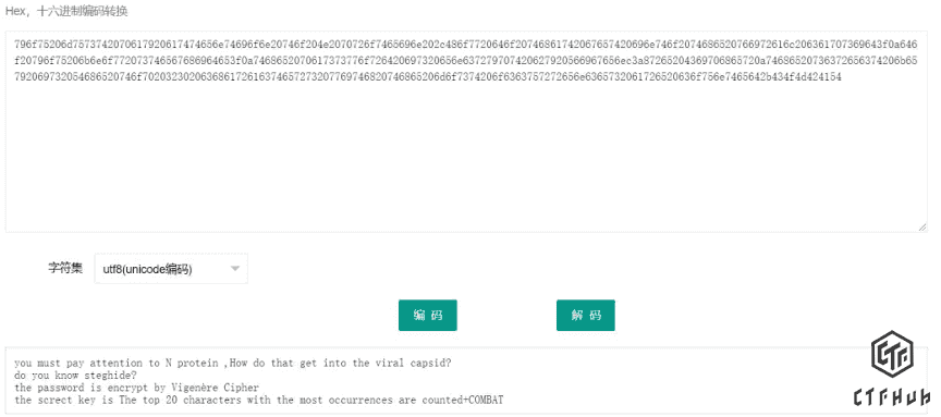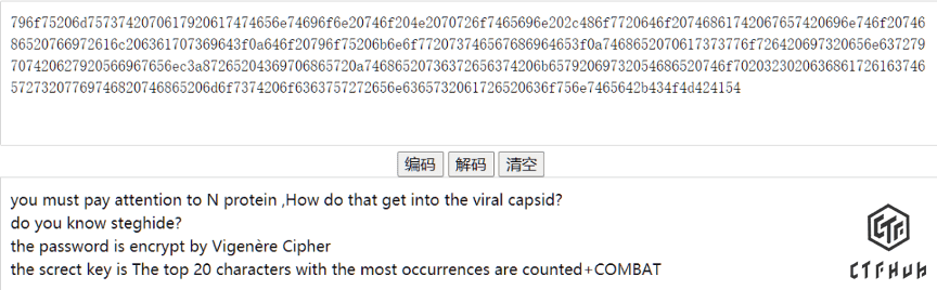 现在我们有开始的那个不知道怎么用的 priebeijoarkjpxmdkucxwdus, 这里又说到了维吉尼亚密码, 开始的数据就是密文了, key 就是他描述的 N 蛋白有关东西的 top 20 的词+COMBAT, 最后就用 steghide 来解密这个图片