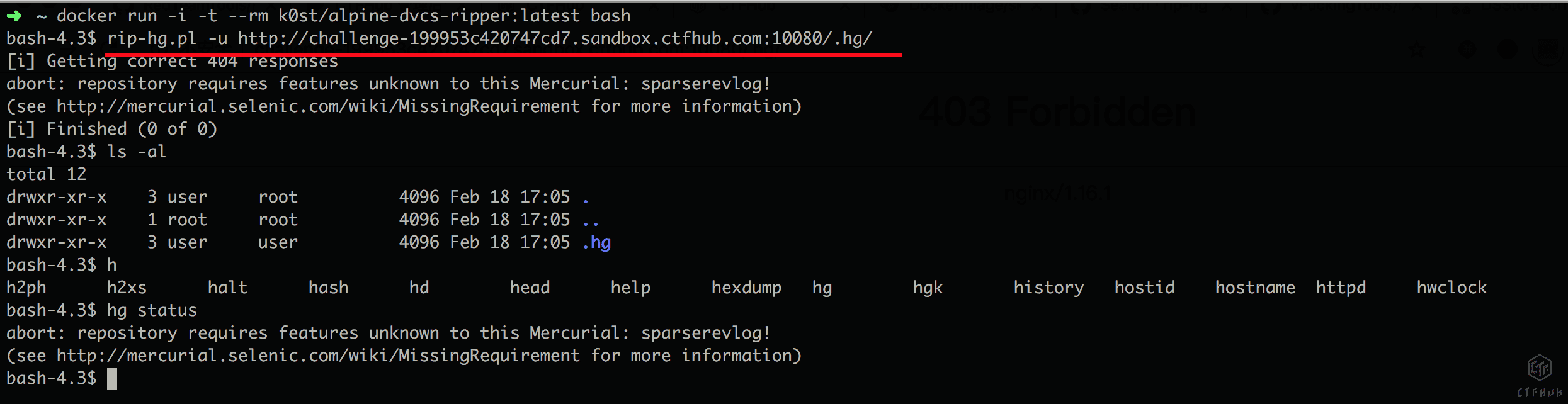 扫描发现有 .hg/ 目录,确认是 .hg 泄露。使用 dvcs-ripper 工具中的 rip-hg.pl 脚本进行 clone.