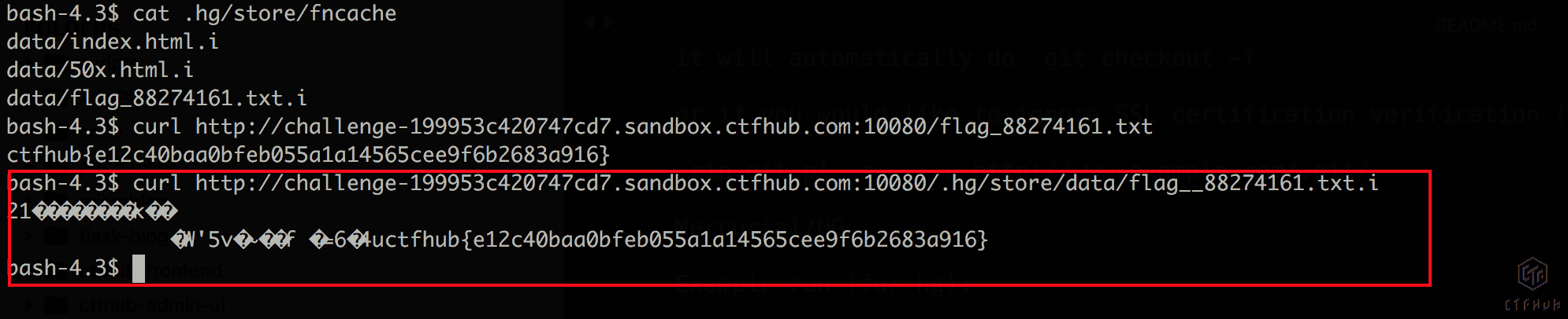 如果服务端删除了 flag 文件的话,那么可尝试从历史记录里寻找。路径是 .hg/store/data/flag__88274161.txt.i 注意下划线是两个