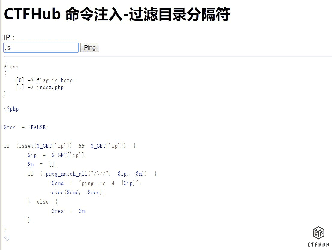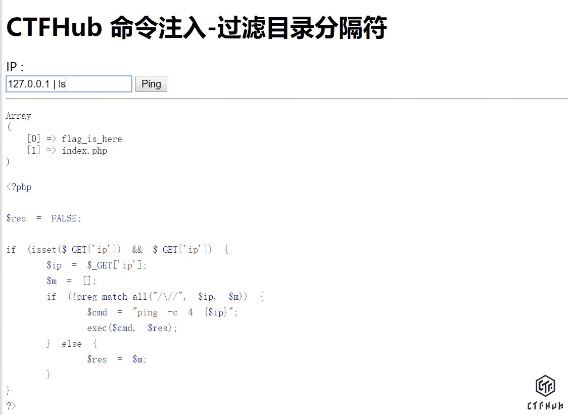 并没有过滤ls和管道符号'|'。这里显示出来了当前目录下存在了一个文件夹:flag_is_here。另外一个index.php的文件,毫无疑问,flag是在flag_is_here文件夹里的。