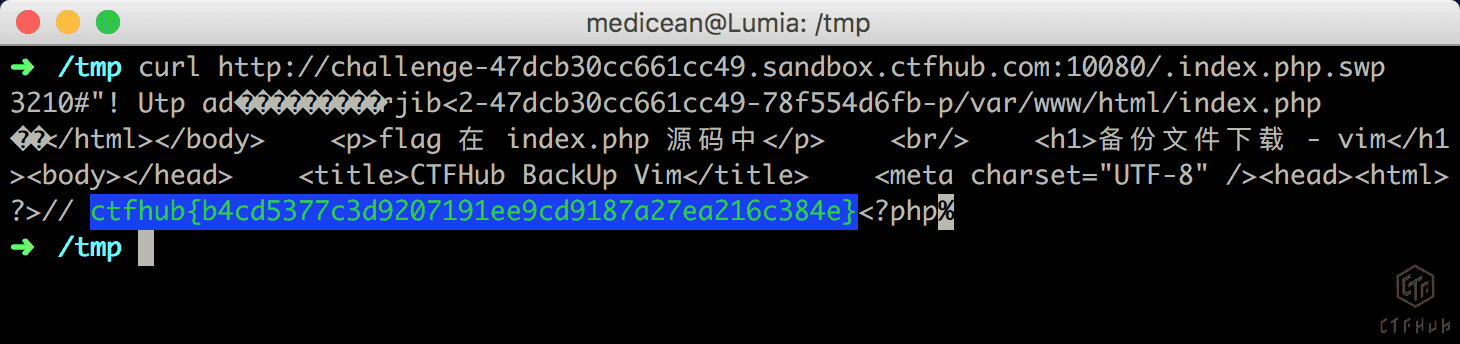 利用curl访问即可直接看到flag,因为vim使用的缓存存储为一种固定格式的二进制文件。而我们一般编辑的时明问可见字符,在vim的缓存中这些可见字符会原样保留
